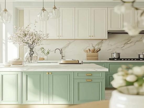 Dies ist ein cremefarbener Küchenschrank im europäischen Stil Die Küche besticht durch einen weißen Wandschrank und einen hellgrünen Unterschrank mit goldenen Griffen. Dadurch strahlt sie eine erfrischende und natürliche Atmosphäre aus.