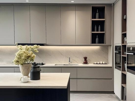 Diese platzsparende L-förmige Küchenschränke Die moderne graue Oberfläche vereint Effizienz und Stil. Sie bietet reichlich Stauraum sowie praktische offene Regale für den schnellen Zugriff auf alltägliche Kochutensilien. Die integrierte Kücheninsel aus weißem Quarz bildet nicht nur einen eleganten Kontrast, sondern dient auch als praktischer und schnell zugänglicher Essbereich für die ganze Familie – das perfekte Herzstück eines lebhaften Zuhauses.