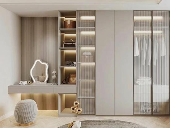 Das moderner Kleiderschrank aus Holz verfügt sowohl über vertikale Glastüren als auch über Spanplattentüren sowie offene Fächer. Es ist auch mit einem Schminktisch ausgestattet. Dieser multifunktionale Garderobe ist für viele Freundinnen geeignet.