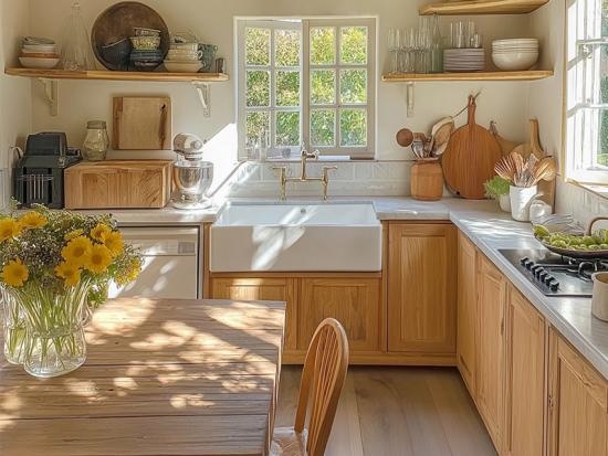 Dieser Küchenschrank aus Massivholz im japanischen Stil vermittelt mit seiner natürlichen Holzfarbe eine warme Atmosphäre. Der Unterschrank bietet zudem ausreichend Stauraum. Es gibt keine Hochschränke. Stattdessen kommen Wandpaneele zum Einsatz, die den Zugriff auf Kochutensilien wie Töpfe, Pfannen und Schüsseln erleichtern.