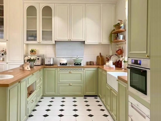 Dies ist ein französischer Küchenschrank mit cremefarbenen und hellgrünen Türen und goldenen Griffen. Die gesamte Küche sieht sehr frisch aus und macht Freude. Die Schranktür ist im Shaker-Stil gehalten, klassisch und zeitlos, eine Anschaffung wert.